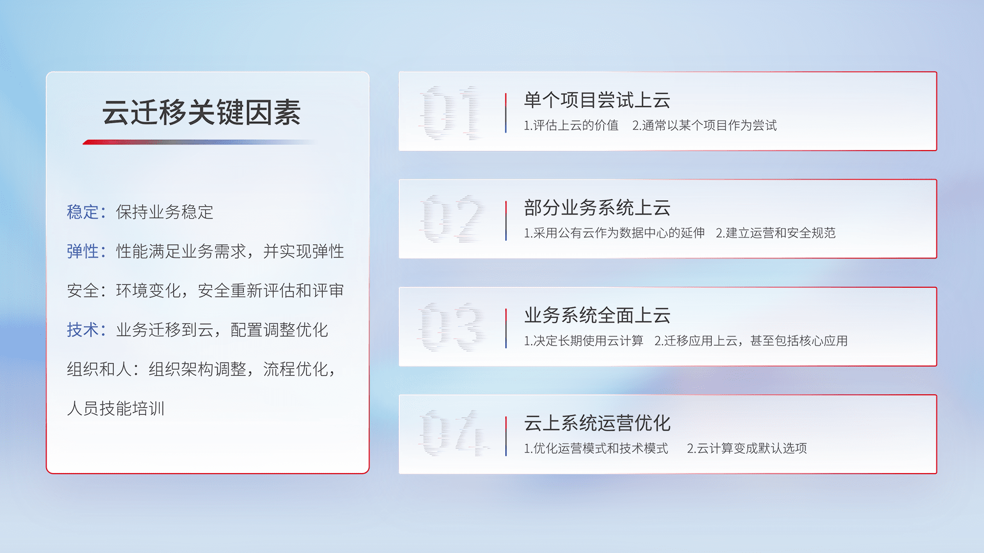 结合实际业务,,,从规划设计、、、云平台选型、、、、云原生改造、、、、数据迁移、、、集成交付,,,,迁移全过程为客户识别最佳上云路径,,,做好风险识别管理,,设计网络架构、、身份权限、、安全审计合规、、、操作审计、、日志审计、、监控告警策略、、、多站点容灾设计等,,,对云上基础设施进行整体规划,,提升IT治理水平,,,以满足弹性、、、高可用、、、、高性能的需求。。。。