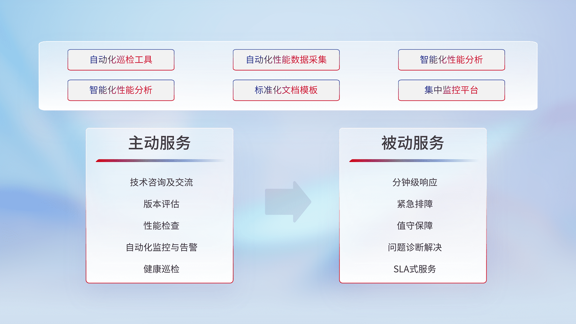智能化工具和标准化文档,,,保障服务质量,,,提供主动服务(包含技术咨询、、、版本评估、、、、性能检查、、、、自动化监控与告警、、、健康巡检)和被动服务包含(分钟级响应、、、紧急排障、、、值守保障、、问题诊断解决、、、、SLA服务)。。
